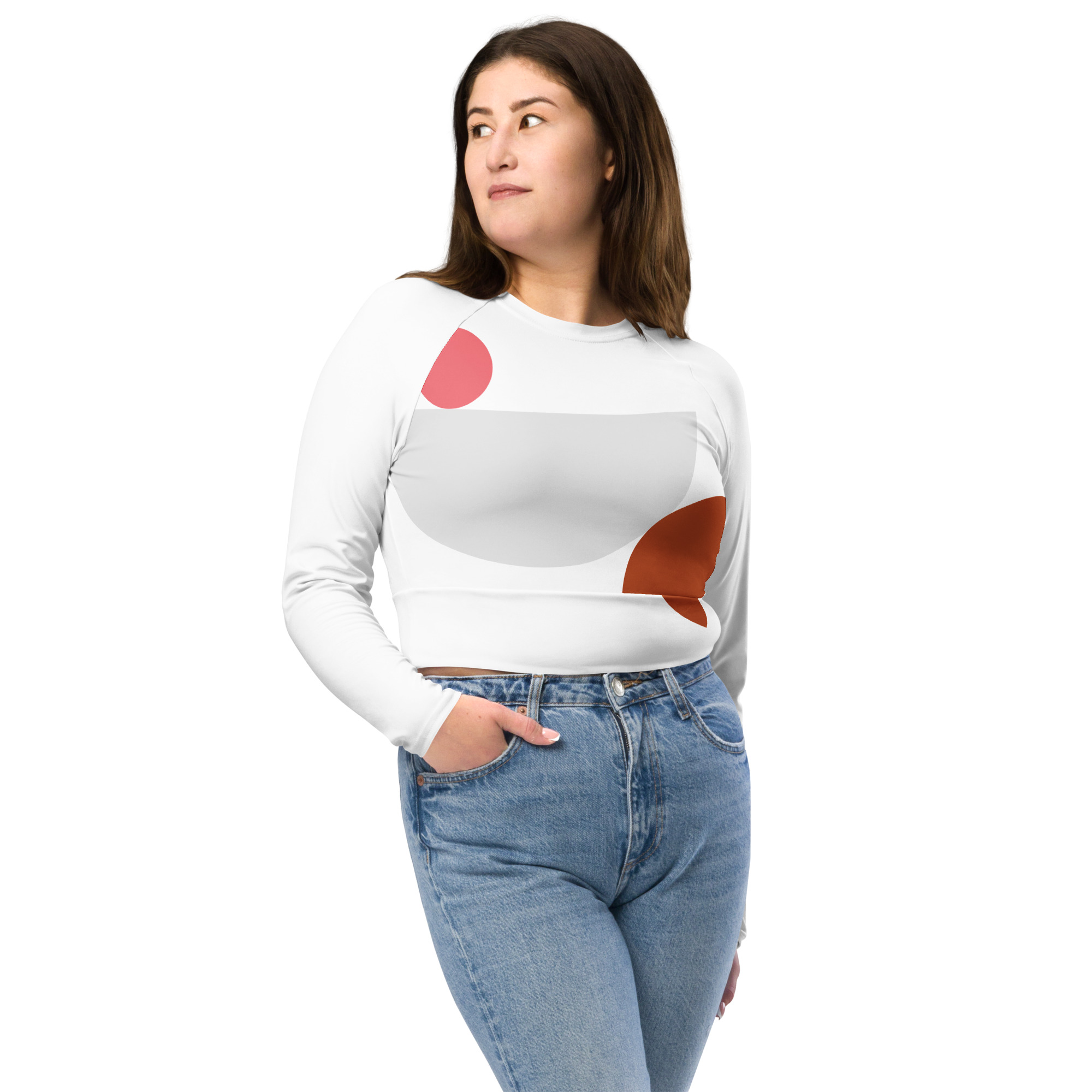 This long-sleeve crop top is made of recycled polyester and elastane, making it an eco-friendly choice for swimming, sports, or athleisure outfits. The crop top has a tear-away care label and a wide, double-layered waistline band for a comfortable fit.
